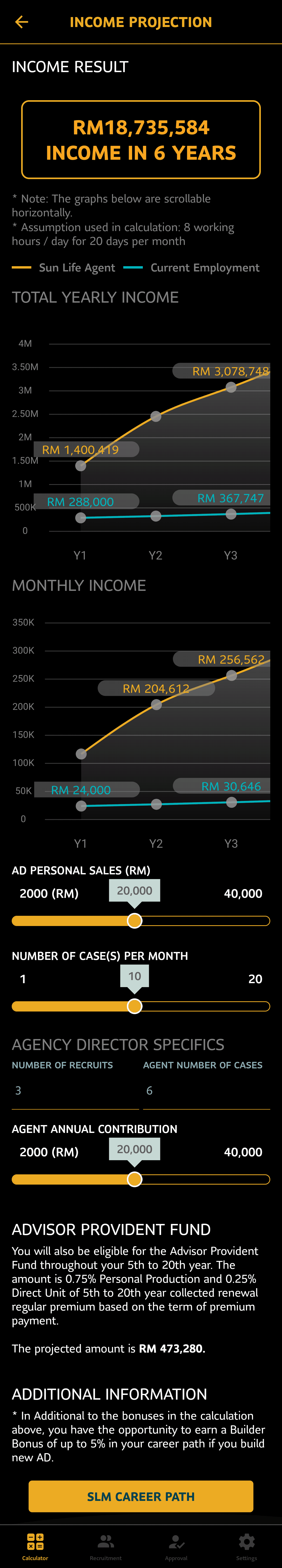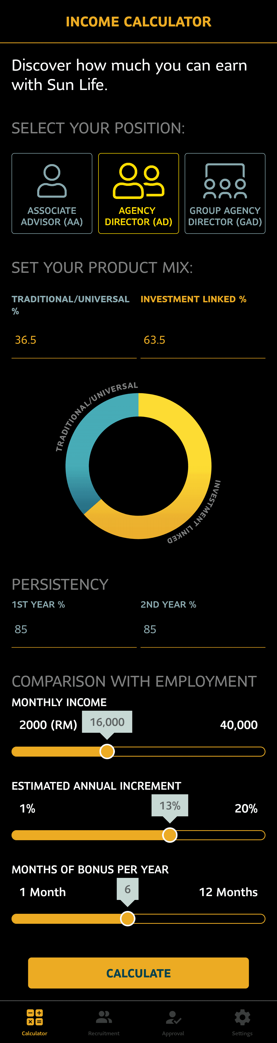 This screen, for instance, mostly involved using RN's Animated and PanResponder libraries for peak performance; in particular Animated.Value.interpolate to derive the position at which UI elements like the slider tooltip / handles or the graph should be (the graph changes in real time as the users interact with the sliders), and calculating the angle with respect to 0° and the center of the interactive donut in the onPanResponderMove callback.