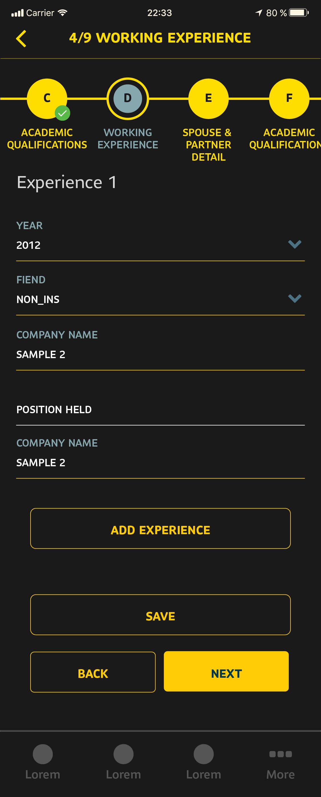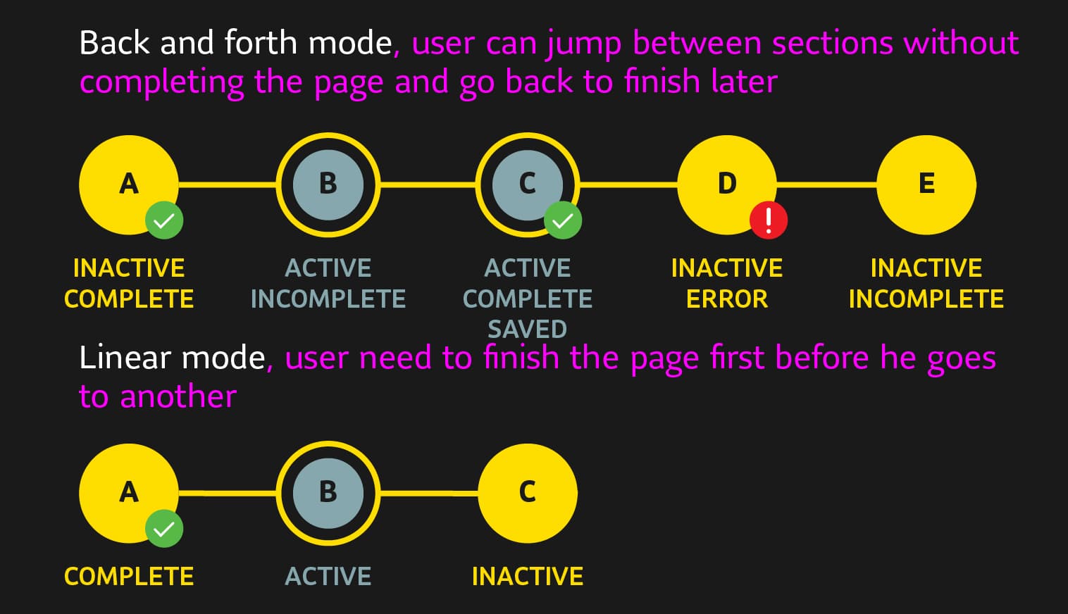 - The form was composed of 9 sections (A - I), with 60+ input fields. The validity of section I conditionally depended on the state of fields in A and B. The number of subsections in sections C and D depended on the state of fields in A.